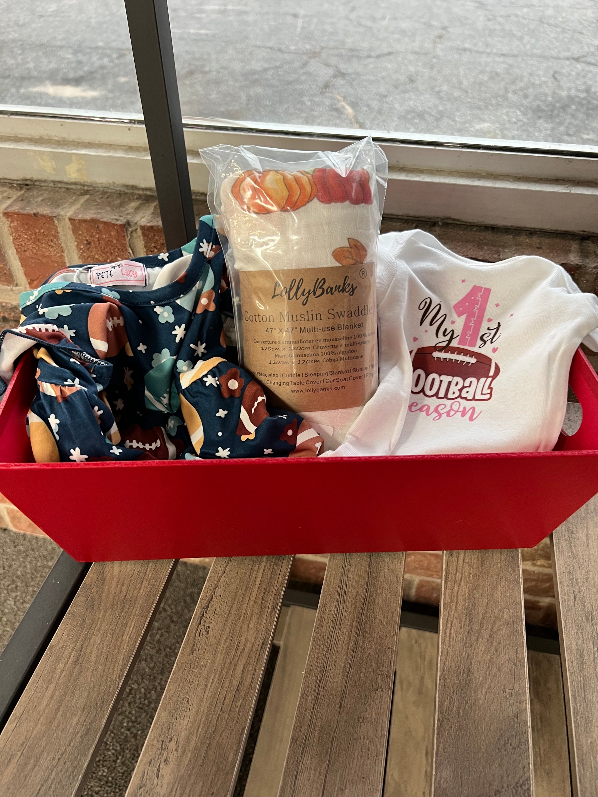 This Basket includes a Newborn 1st Football Season onsie , Pete & Lucy Football outfit and Fall theme Swaddle blanket. Gift wrapping included!
