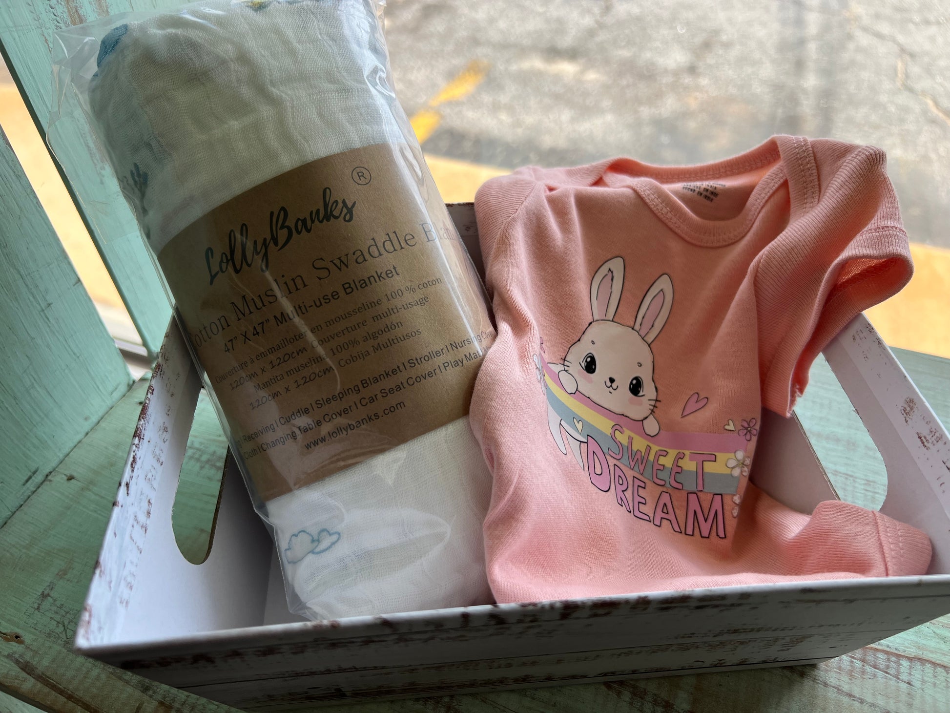 This Basket includes a Newborn Sweet Dreams Bunny onsie and a Bunny themed Swaddle blanket. Gift wrapping included!